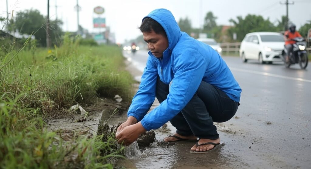 During heavy rainfall, large amounts of water need to flow quickly away from roads and streets. Culvert drains are designed to carry rainwater under roads and guide it safely to canals, rivers, or drainage channels. However, when culverts become blocked by mud, leaves, plastic waste, tree branches, or garbage, water can no longer flow freely. This causes rainwater to back up and flood the road surface.